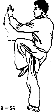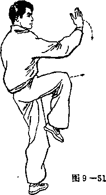 ③ 动作不停。身体重 心前移,左脚尖外撇,左 腿膝微屈独立右腿屈膝 上提,脚尖下垂,成独立 势。与此同时,左手向前 伸,然后掌心朝下向下按 于左胯旁右手勾手变掌 由后向下顺右腿外侧向前 上弧形屈肘上挑,掌心朝 左,掌指朝上,肘与膝相 对。眼看右手方向。此时 为呼气结束(见图9一 51)。