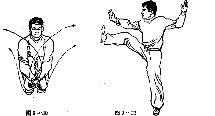 里,左手在外。眼向前平视。此过程为吸气(见图9 一30)。
