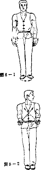 动作分解:两脚踉并拢成八字站立,两 臂自然下垂,五指并拢紧贴于两腿外侧。直 膝、收腹、挺胸成立正姿势。两眼向前平视 (见图8—1)。 要领说明 沉气实腹,蓄劲。