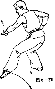 动作分解 重心后移,左脚收回半步成左虚步。 同时,右爪变拳,屈肘收回腰间左掌从 右小臂上向前下方切掌,掌心朝下,掌指 朝右,高与裆平。眼视左掌(见图8 —22)。 要领说明: 切掌与收右拳成虚步同时完成,左掌 从右小臂上有力下切,力达掌刃。
