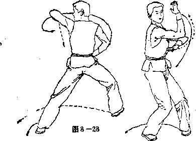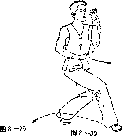 动作分解 右脚经左脚前向右横撤一步,重心 右移,向左转体90 °成左虚步,同时,左 爪收回置于腰间,右爪变掌向下、向前 插,掌心朝下,高与裆平,眼视左掌 (见图 8 — 31 )。 要领说明 以腰带臂,随转体插掌要有力,动作协调,力达掌尖。 第二段