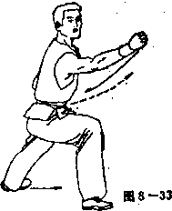 动作分解 右脚向前上一步,左腿后蹬成右弓 步。同时,左掌变拳,屈肘收回置于右腹 前;右拳向前冲出,拳眼朝上,高与颈平。 眼视右拳方向(见图8—33)。 要领说明 弓步与冲拳同时完成,沉气实腹,力达拳面。