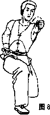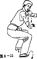 动作分解 ①上动不停。左腿后蹬向前收回半步向右转体时°成骑 步。同时,右拳屈肘收回腰 间;左拳随转体向前平冲,拳 眼朝上,高与胸平,眼视左 拳(见图8—34)。 ②上动不停。向左转体 90°,左膝外翻成马步。同时左 34 拳变爪收回置于右胸前> 右拳 变爪向内旋臂,随转体向右、 向下击爪,爪心朝外,大拇指朝下,高与裆平。眼视右爪 (见图 8—35)。 .要领说明 要动作协调,快速有力,拧腰收腹,气沉丹田,以气催力