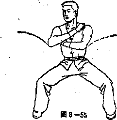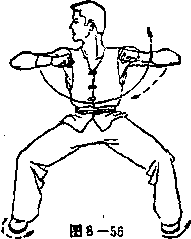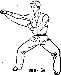 动作分解 右脚提起,经左脚内侧向前上一步,向左转体90成马 同时,右爪变拳,左爪屈肘回收, 置于胸前;右拳向前随转体向左划弧贯 拳,右肘微屈,拳心朝下,高与颈平。 眼视右拳(见图8 — 54)。 2. 上动不停下肢不动,左爪变拳 不动,右拳屈肘回收置于胸前,随即, 两肘向左右两侧撞肘,拳心朝下,拳、 肩二肘在同一平面上,两肘与肩成一直 线《眼视右肘方向(见图8—55、8—56)。 要领说明 ;步与贯拳协调一致,双撞肘要一气贯穿,气沉丹田,开 胸,实腹,发声助力,力达肘尖。
