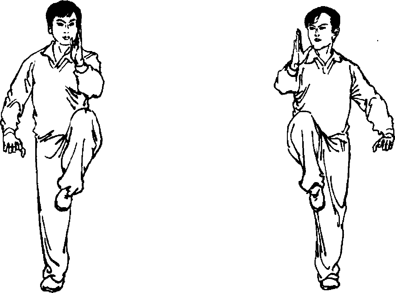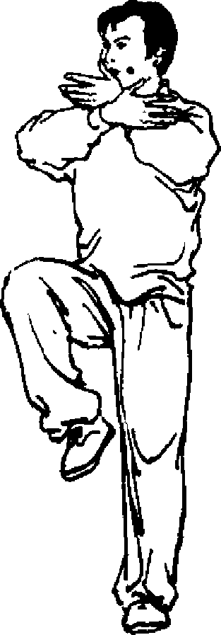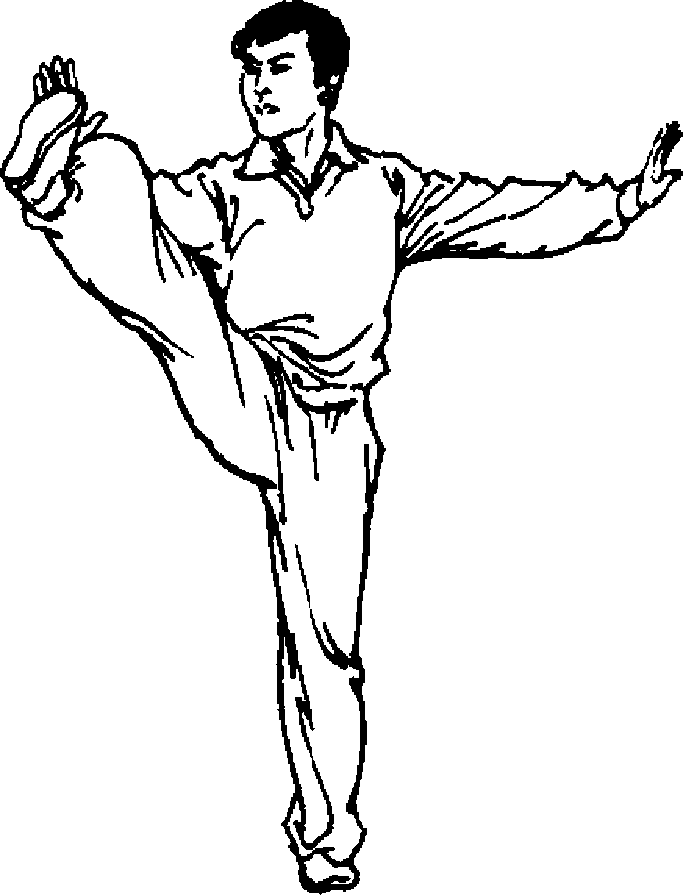 身体自然站立,重心移于右腿,独立支撑,左腿屈膝上提 于体前,大腿高于腰位的水平线,小腿下垂内收,脚面展平。左 手成侧掌挑举于头前,指尖与眼平,右手下按于体侧。上体斜 向前方,眼看左指(图128)。以此势练至体力稍感不支时,左 腿下落,左脚踏实,身体重心移于左腿,左腿独立支撑,右腿屈 膝上提至体前(图129)。如此左右两腿轮换独立控腿练习。
