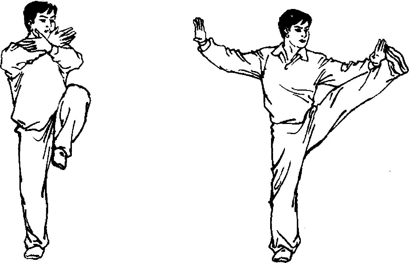 2. 蹬脚控腿时,两腿都要蹬直。蹬出 尽量高举,脚与前手上下相对,上体保 持正直。