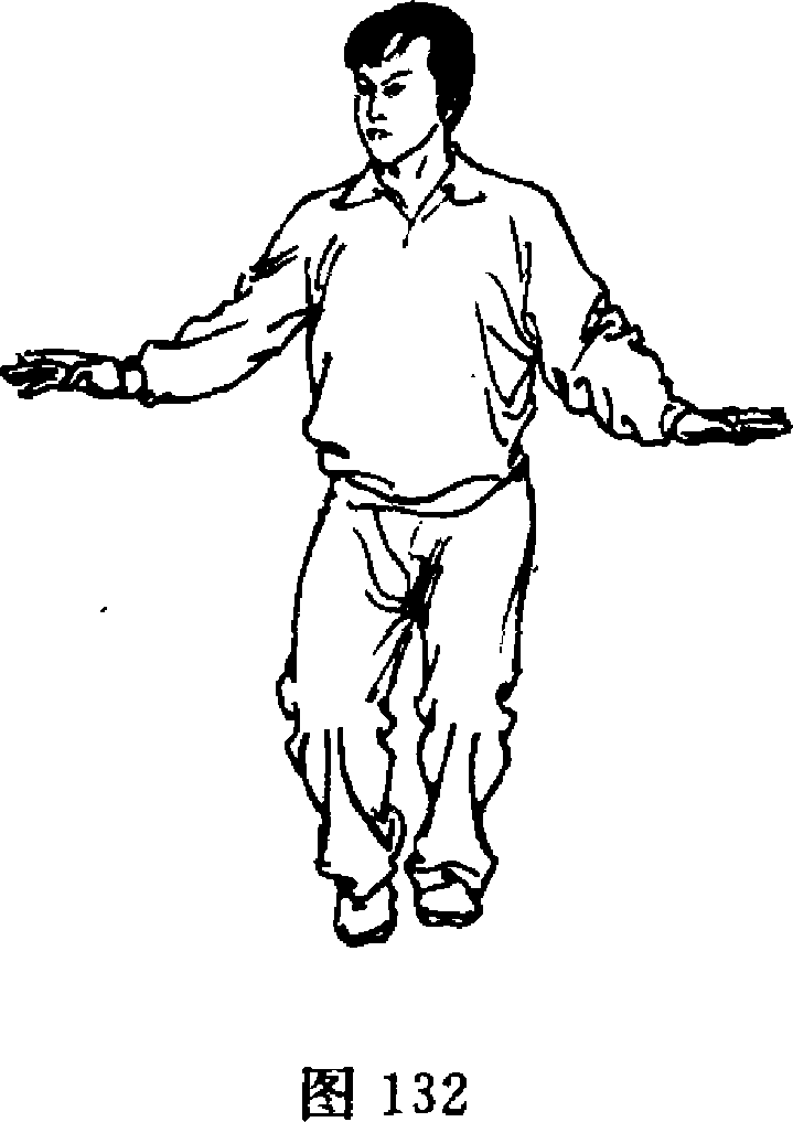 ⑤ 图130图131两手经头前划弧分开,举于体侧,掌心向外,两臂微屈。 同时右脚向前上方慢慢蹬出,控腿高举,脚跟用力,脚底朝上, 全身平衡静止。眼平视右前方(图134)。待体力不支时,再屈 腿落脚,换成左蹬脚控腿。如此左右轮换练习。