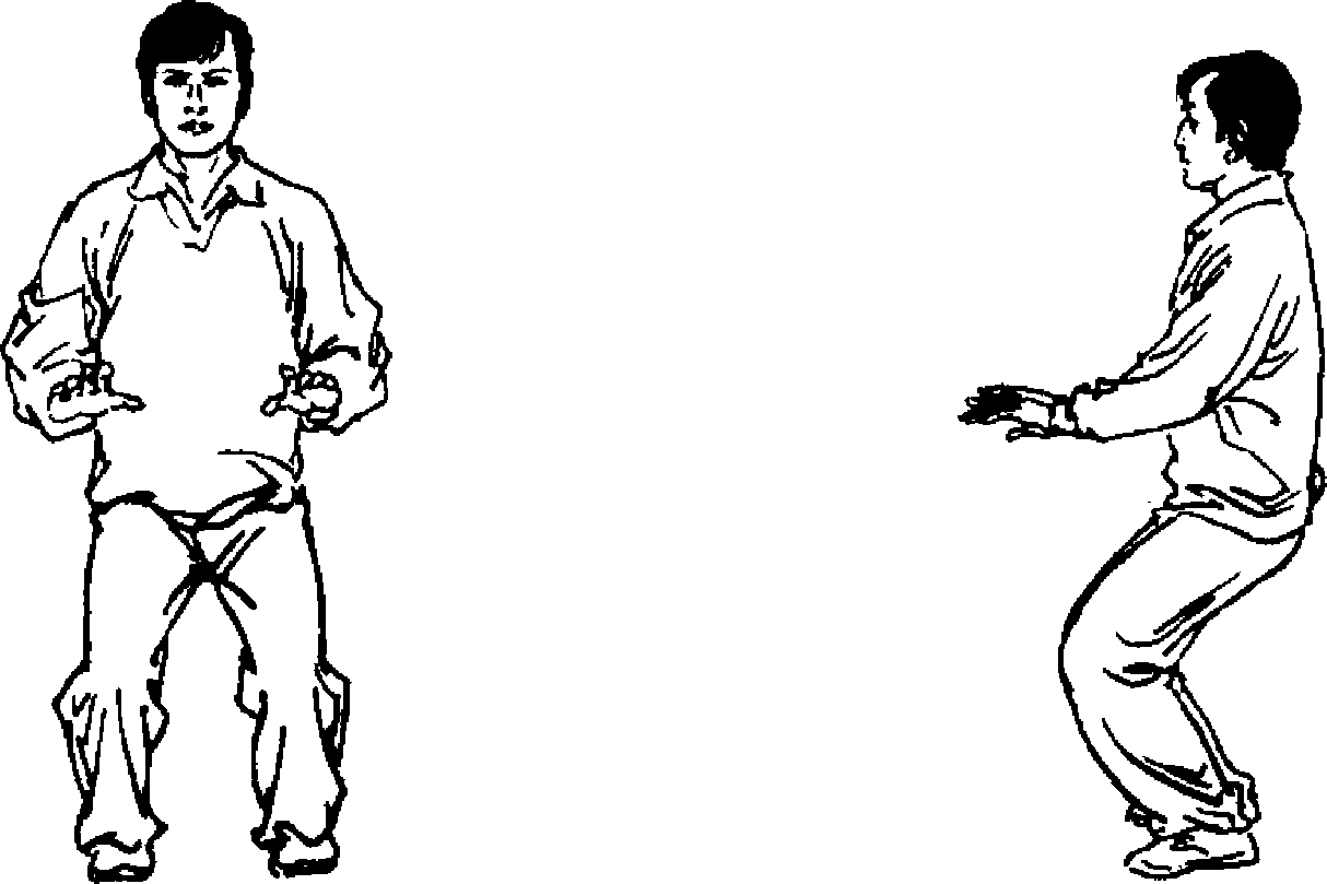 1. 上体始终保持预备势姿势,顶头、正脊、沉肩、坠肘、含 胸、松腰。屈腿蹲坐时,如端正坐于椅子上,缩胯收臀,上体松 正,两腿坚实着力,体重平均落于两脚。至两腿微感酸热时,再