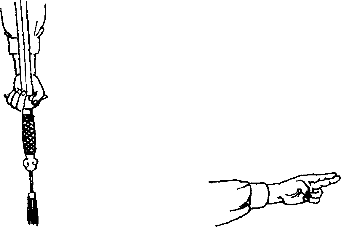 剑身贴在前臂内侧,食指伸直贴于剑柄,其余四 指握于护手(图4)。这一把剑方法,一般用于左手, 起势动作就用此把剑方法。有一种叫反把剑的剑术, 用右手持剑也用这一持剑方法。