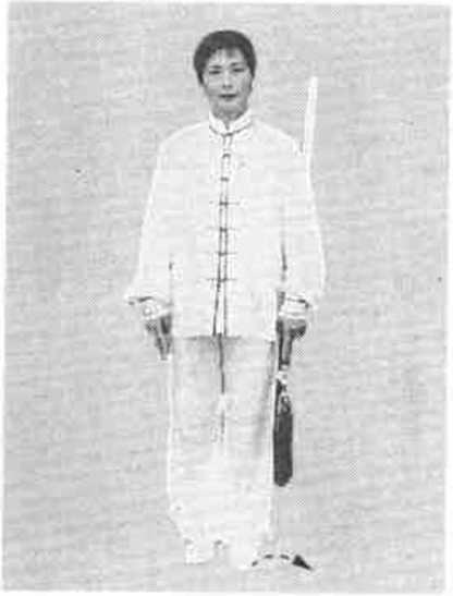 两脚并立,两腿自然伸直;两臂下垂,左手持剑,手心朝 后,食指贴住剑把,剑尖向上;右手下垂,食指、中指成剑 指,指尖轻贴于右腿外侧,其余三指卷屈,手心朝内;目平视 前方,面朝南(图1)。图【要点】(1) 顶劲上领,意念集中。(2) 全身放松,切莫耸肩。(3) 神态自然,不要怒目。
