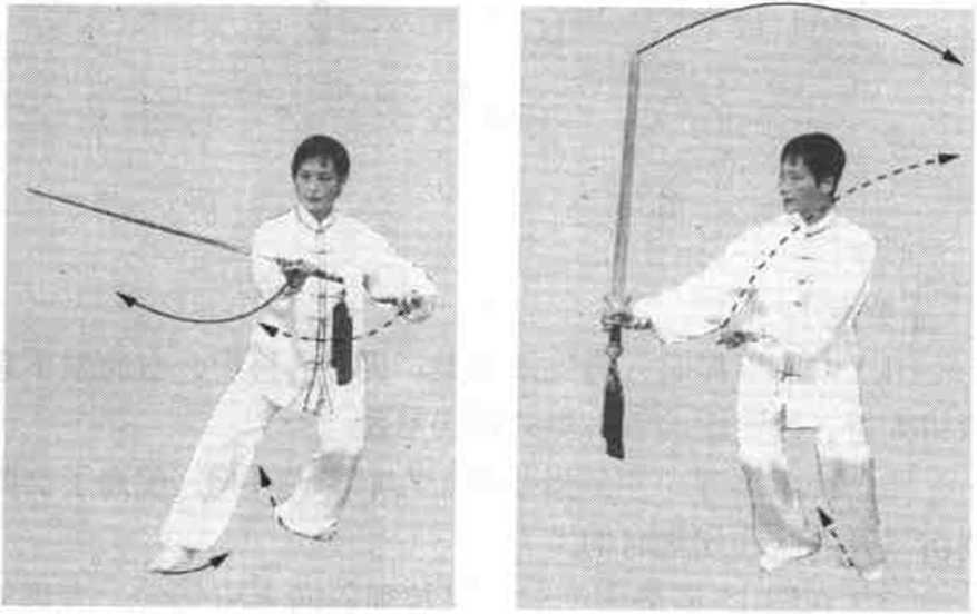 (2) 图16转向图17时,右脚后撤,右脚尖的外撇度要 小,大了会影响下一势的定型方向;右手剑的弧形回抽中,幅 度要大些,剑尖由偏后向中线上挑。