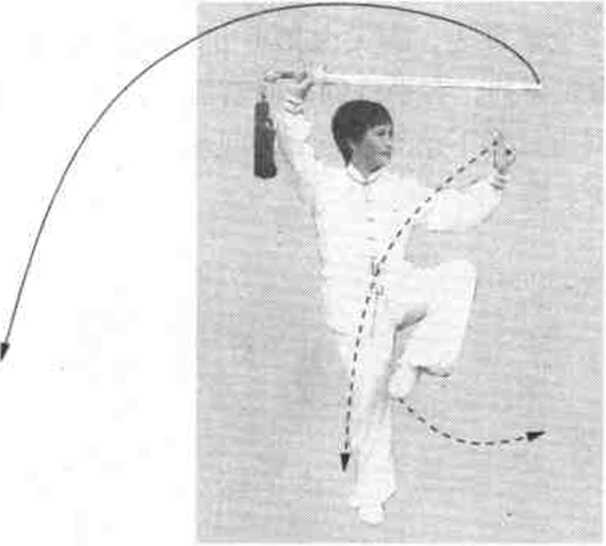 右腿自然伸直站起,左膝上提,脚尖下垂,成右独立步: 同时,身体略左转?右手持剑上举,手心朝外,经头上方立剑 剌出,刀达剑尖;左剑指向左前指出,腕与肩同高,手心斜向 前;方向东南(图18)。