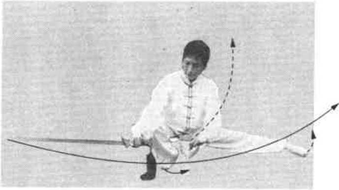 ?身休右转,重心下降,右腿屈膝全蹲,右脚尖外撇;左脚 落地,自然伸直,全掌着地,脚尖内扣(方向向东),成左仆 步;同时,右臂由屈至伸,右宇持剑,向右后立剑下劈,手腕 与右膝同高;左剑指弧形下落至裆前,手心朝下,指尖向右; 面朝南.目侧视剑下劈(图19)。