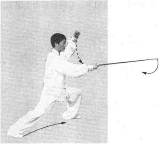 向左转体,左脚尖外撇,重心上移至左脚.右脚尖内扣, 成左弓步;同时,右臂外旋,手心翻向上,持剑自下至上向前 扫出,力达剑尖,高与胸同;左剑指向左后划弧上举至左额上 方,手心朝前,指尖向右;面向正东,目视剑前方(图20)。 【要点】
