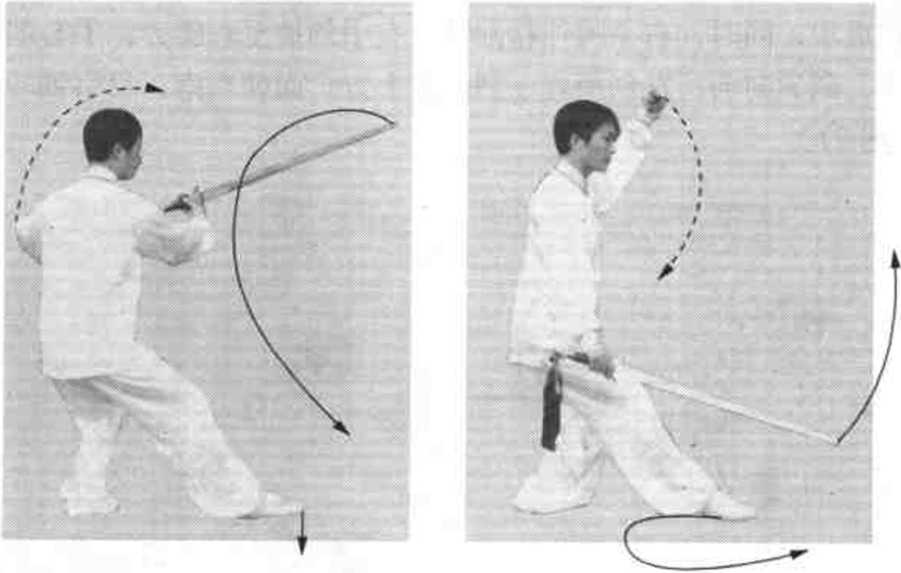(2) 图68转为图69的过程是:上身再稍向左转,带动右 手剑右绕,右手腕翻转,剑尖由原向前转向左,使剑尖划个大 弧,然后随着上身右转,将剑带向右下截。动作必须连贯协 调。