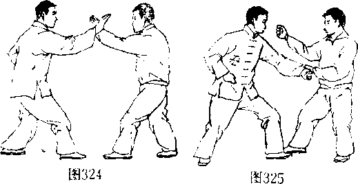 (1) 甲以顺步右扑面掌虚击乙面门,乙若用左手由里 向外、向上格拦,甲则迅疾上左步,步踏乙中门,同时骤发 .左崩拳猛击乙胸腹部。(图324、325)