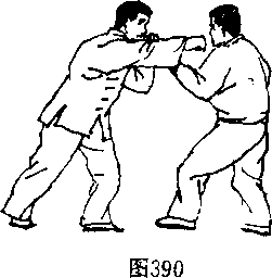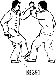 (1)甲以拗步右崩拳击打乙咽喉或面门,乙若用顺步左 挂掌格拦甲右小臂,甲即以左手由里至外刁捋乙左手腕,同 时后脚上鸡形步,踹踢乙前腿胫骨。(图390、391)(2)动作不停,若乙前腿后缩闪避甲右踹腿,甲则右脚 迅疾向前迈步,左脚跟进半步,同时突然松幵刁捋乙之左 手,以右拳或掌猛劈砸乙面门。(图392)动作要领:甲右崩拳击打要虚,左手刁捋和鸡形步踹踢须同步。无论踹踢成功与否,右 拳或掌均应猛烈劈出,并应充分 借助上步之势。