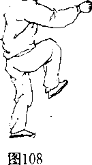 接着,右足下落,左手变掌上抬,髙 与肩平,手心朝下,同时左足屈膝提起,膝 与胯平,右手随即收至左肘下方,手心朝 下,手指成鹰爪状(也可呈平掌),身体 稍前術,右腿稍向下屈蹲。目视左手背。 (图 109)