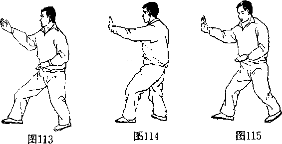 接上势,右掌变拳内旋,由胸前上钴,右足向前垫一步 足尖冲前,左足向前迈一步,右足跟进半步,同时,左手由 右拳上方向前打出,成竖掌,掌心向外,右拳变掌收于腹前 掌心朝下。目视左手虎口。(图114)