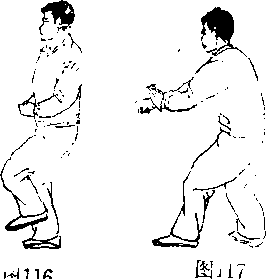 左足向前一步,右 :足跟进半步,左拳变掌 护于右拳内侧,右拳向 前下方打出,高弓脐 冃视右拳。(图117)
