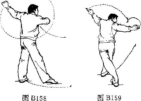 (1) 练法动作与第46势“倒插步单鞭劈掌”相同,唯方 向相反。(图159)