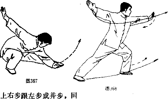 重心前移成弓步过渡势。(图368)向左前方落左脚,成彳卜步,左手沿左腿内恻穿出至脚前。 (图 367)重心前移成弓步过渡势。(图368)图369时,右手经腰间向前平直打 出;左拳收于右肩前(两手均 成立掌)。目视右手方向。(图 369)图369要点:成仆步时,上体前 探并下压,两手远伸。弓步过 渡要快。成并步打掌时步法要 连贯,打掌与跟步要一致,力 点在掌根或掌外侧。