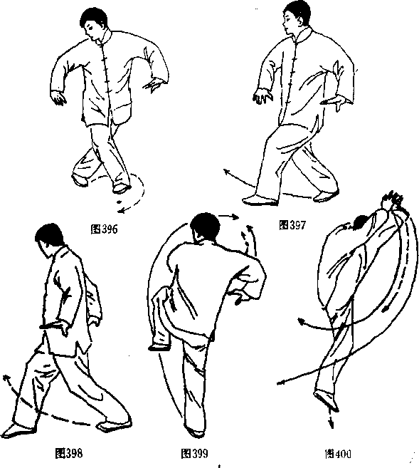 身体继续向右转,帯动左脚向右前方上步,脚尖内扣, 目视前方。(图397)右脚仍向右前方上步,脚尖外展。(图 398)左腿向右前方猛摆起,使身体右倾,右脚用力蹬地,两 手臂协同上摆。(图399)右脚蹬离地面后,向上、向右直腿 摆动,此时身体向右转动,右脚经面前时脚掌内扣。同时, 两手由右向左迎击脚面,使之出现两次击响。(图400)