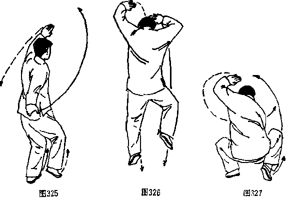 重心下降,右手摆向身后,手心朝下;左手将掌立起, 手心朝里。目视前方。(图325)左腿上摆,右脚蹬地,身体向上拔起,同时,右手握拳, 由后向上拳至头上,手腕内屈;左手向下摆至侧平拳手心 朝下。目视前下方。(图326)身体下落,两脚落地,左脚踏实,右脚前脚掌点地成丁 步。同时,右拳向卞垂直击打地面) 左掌摆至头}:方。目视 前下方。(图327)要点:重心下降时,身体不能僵硬,做好跳起的准备姿势。拔起时两手的摆动要协调一致,落地要稳,击地有力。