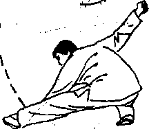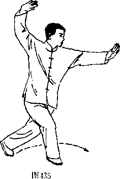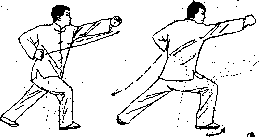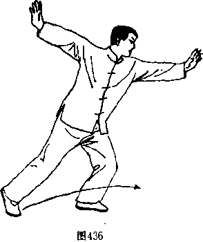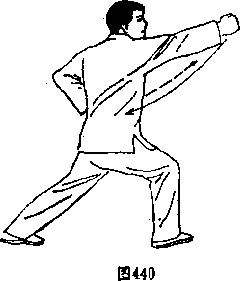 、: 与上述第7势“野马奔槽抄手起脚”动作相同。唯行步时 右手呈上架势。(图435、436、437、438、439 ) 图437 图438 13)弓步三拳 右脚前落,成弓步,并向前冲右拳。(图440) 动作不停,再冲左拳,右拳收千腰间。(图441)再冲右 拳,左拳收腰间。(图442) , 珀441 (14) 、:仆步身下穿掌 右腿下蹲,成左仆步。左 、: 手变掌,沿左腿内侧伸至左脚 处,拇指侧朝。肖视左手方 向。(图44) ' 图443