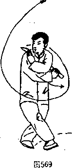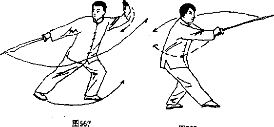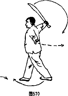 肩外侧绕行,再向下、向后拉回,肘略屈,刀刃朝下,刀尖 朝前;左手从后经腰部向前成立掌平直推出,掌指朝上。目 视左掌。(图572)
