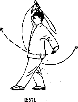 ③ 左脚前上一步,脚尖虚 点地,右腿屈膝,右脚踏实。右 手持刀臂外旋,向上拳刀,手心 朝上,刀刃朝后,刀尖朝下, 左手后摆成按掌,掌心朝下, 掌指朝前。目视前方。(图571)