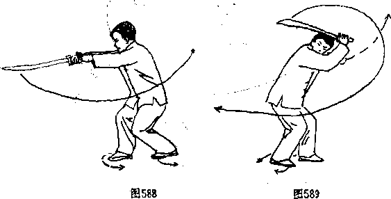 ①两脚辗地,右脚内扣,左脚外展,体左转。同时,右 手持刀屈臂向下、向上往回带刀于头上,刀刃朝上,刀尖朝 后左手随右手同行广音视右下方。(图589) ②右脚外展,左脚向右后方插一小步成歇步,臀部坐于左 脚跟上,两腿夹紧,重降低,上体前压。右手持刀自上向 前、向下、向右撩刀,刀刃朝上,刀尖朝右;左手随之向左 推出成立掌,掌指朝上。目视刀。(图590) 要点:皮撩始时身体略向前俯。