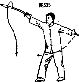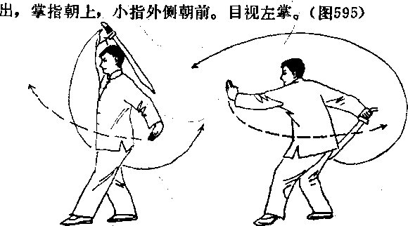 ①右脚从体后向右跨一步,左脚前脚掌辗地,上体右〃 转。同时,右手持刀向右后上方扫刀;左手下摆成按掌,手 心朝下。目视前方。(图594)