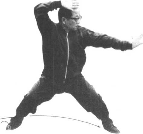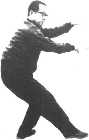① 将重心移至左足,右足轻轻往 后拉,用提笼换步使身体向右 回转。右掌向外侧放,左掌则 自后上方向前方落下。用例:对方用右拳攻击时,就用 右掌在外侧抵挡,破坏对方 的体势。② 右足踩下去,左足前 进成马步,同时将左 掌向前方打出。右掌 收回至额前。用例:继续前面的动作 ,用右手破坏对方 体势的同时,踏地 ,用左掌攻击对方 的侧腹。