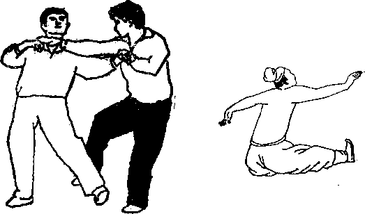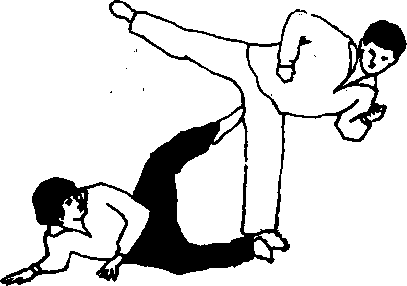 (2)敌如以高腿向我上路攻来,我可就势下蹲 后倒,同时以右腿向前铲击敌支撑左腿(图1一97 );.