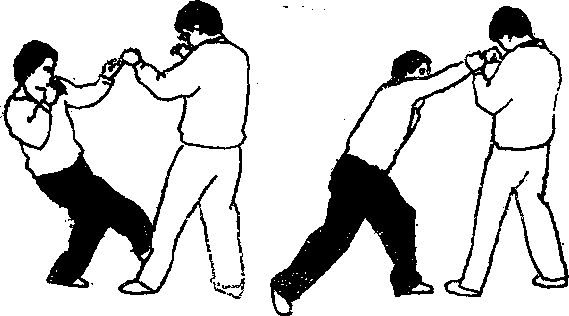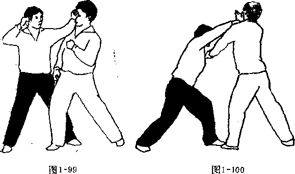 (6)我击打敌面,敌如格抓,我就势采拿其左 :腕,速即滑步进身封住敌腿,同时以左肘猛击敌胸 (图1—101)。