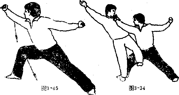 用法:横扫跌系进身跌敌之要法,我撩挂敌腿敌 如未跌,可乘其欲跌之势窜步进身以右腿管住敌双 腿,使其欲走不能,速即以右臂横扫敌胸,使其跌倒 (附图 3—34>。