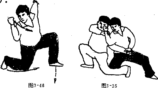 要点:坠肘及下跪要同时迅猛,身体重心应猛然 沉于右臂及右膝上.