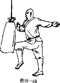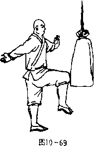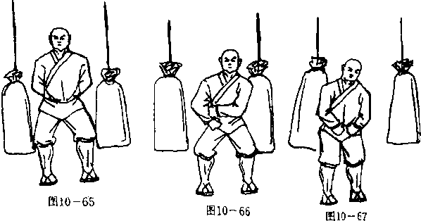 沙袋两个,内装黄沙2〇斤,悬吊起来。1. 2.—腿直立支撑,一腿屈膝提起,以膝关节顶击沙袋马步站立,以胯左右靠击沙袋網10—65、66、67>,2.—腿直立支撑,一腿屈膝提起,以膝关节顶击沙袋每日早、中、晚练习三次,开始时每次练习100—200 次,循序渐进,逐渐增加数。
