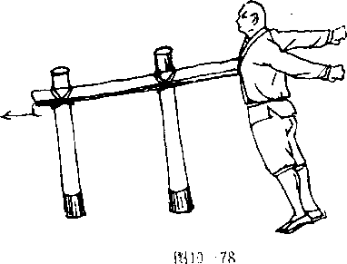 此功最好是在练习木槌排打、铁槌排打、压腹功的基础 上练习,或与上述功法配合练习,效果更好.木桩两根埋于地下,上架横木一根,固定在两个木桩 之上.以腹部撞击横木一端,每天撞击500次左右,逐渐加 大撞击力量(图10 — 78) 2?以腹部抵枪尖,开始时动作轻缓,逐渐加力,动作加 快(图10 79) ?