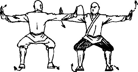 甲乙双方两脚为轴,体左转〇,两腿成马步;甲两拳 变掌,双方同时各向两侧推掌,掌心向外,掌指向上。目枧 前方(图2 —135)。图2—135