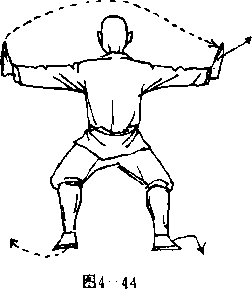 两脚跳起,体右转180°, 两脚震脚落地,两腿成马步 同时,两掌随势向两侧展臂猛 推,掌心向外,掌指向上。目 视前方(图4一44)。实战应用:马步站桩是对 付敌人横击,两掌外推是防护 两侧不受敌人攻击。拳谱曰:“马步羊鞭站桩功,手脚四肢拉四平.两脚两啃和收手,行动战斗应用灵,两掌推出彳钧力,左右功力两相等。延年益寿见效果,身心健泰耳目明