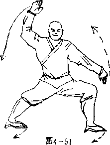 抬右脚震脚落地,左脚前 上一步两腿成左弓步,体右转 90同时,右拳变掌,上架 于头上前方,掌心向前,掌指 斜向左> 左掌变勾手,向体左 后侧崩击,勾尖向下。目视左 侧(图4一51)。