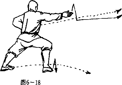 右脚在前方落地,左脚尖内旋,两腿成右弓歩;同时, 右掌向前下方猛力劈击,掌心向左,掌指向前;左臂屈肘右 掌收护于胸前,掌心斜向前,掌指斜向上。目视右侧(图 —18 )