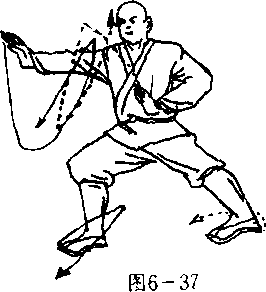 两脚蹑地,体左转90°,两腿成左横弓步,右脚向前抬 腿,再向后挂勾落地,两腿成左横弓步:同时,左掌由右肩 顺右臂下抹,再向上提,屈肘护于右肩上部,掌心向后,掌 指斜向上;右掌在左掌下抹的同时向上提,在左掌上提时,