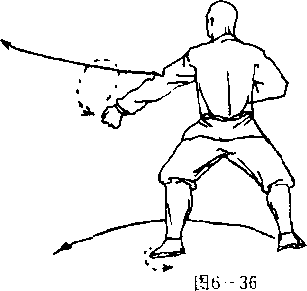 拾右脚谅地谣脚下 落,体右转〗80°,左脚向 左横跨一步,使闽腿成马 步;同时两拳变拳,左拳 栽于左侧方,拳心向前, 拳眼斜向外;右臂屈肘右 掌收护于胸前,拳心向 内拳眼向上目视左前 方(图6—36 )。