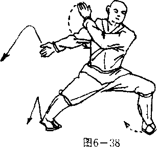 右掌向下按于右侧方,掌心斜向下,掌指斜向右.目视前左 侧(图6—38 )。