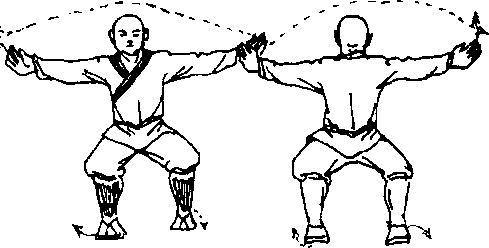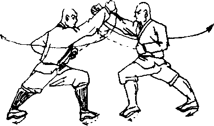 甲两腿变成左弓步,右拳直击乙头部,拳心向右,拳眼 向上;左臂屈肘左拳收回,护于胸前.拳心向内,拳眼向 上。目视乙方,乙两脚后移,两腿落成左弓步;同时,右拳向前拨打甲 右拳,拳心向右,拳眼向上;左臂屈肘左拳收护胸前,拳心 向内,拳眼向上。目视对方(图9一101)。?9 101上动不停,双方两脚为轴,体右转90°,两腿成马步; 同时两拳变掌,向两侧推展,掌心斜向前,掌指向外。目视 前方(图9—]02)?9 101610