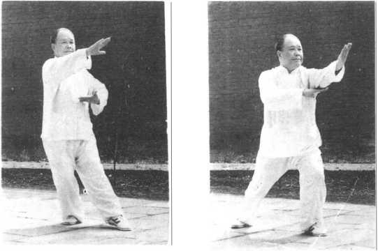 口诀:翻左掌(掌心侧向上),松开吊手屈右臂,右掌向前探 出,左掌收至左胯旁,摆正左脚。左脚跨出,弓左腿,出左臂,右掌收 至左腋下。