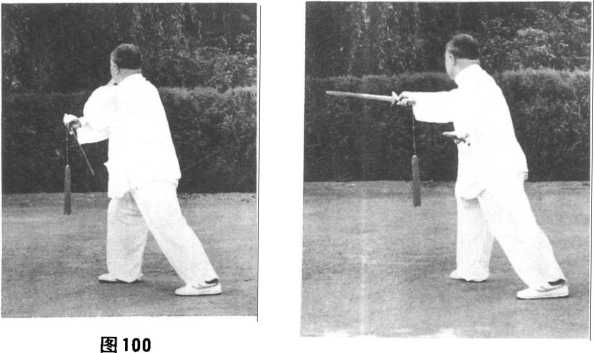 动作1:重心后移,身向右后转,左脚顺势向里扣,然后重心 倒至左腿,提右腿向右侧迈出,逐渐成右弓步。两臂随同转体交 叉在右后(图]00)。动作2:当右腿逐渐成弓步之同时,右手持剑向上往右,复向 下以正手立剑下刃劈之,左手同时向左下分开。面向西北角,眼 看剑尖前方(图101)。图101用法:向身后抡劈。要点:该式是先倒腿以后,才上步抡剑砍劈,因之,整体配合(也 就是腰、腿、臂的协调方面)必须一致。由反手立剑转正手立剑 的过程(随同腰腿变转),强调随转随翻,腿到、身到、剑也到, 一定要协调一致。